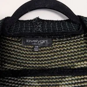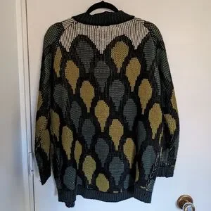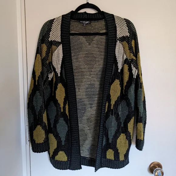 Patterned open-front cardigan sweater. Featuring a geometric pattern diamond or harlequin-like pattern in black, green, and yellow, this sweater is perfect for layering.