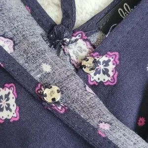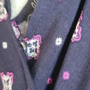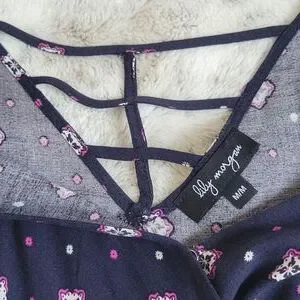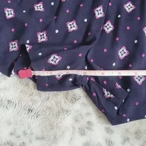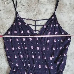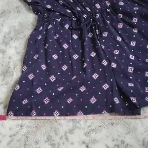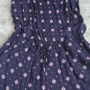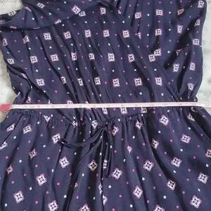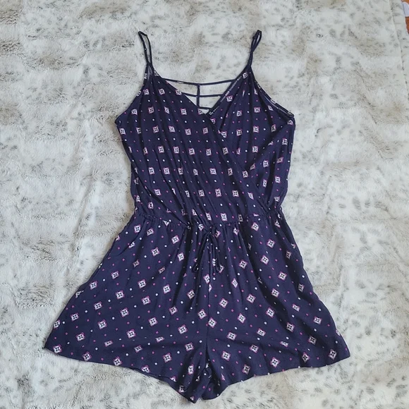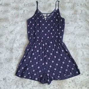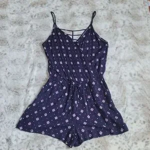 Patterned romper. Size medium. Adjustable spaghetti straps. Caged back. Faux wrap with a button to secure. Elastic waist with drawstring. Pockets. Never worn.