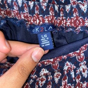 Blue, red, white patterned skirt