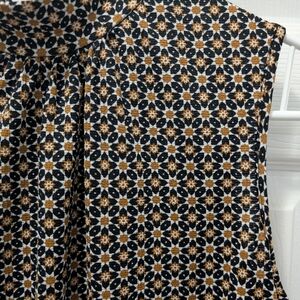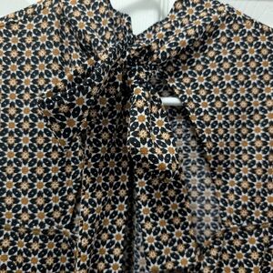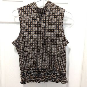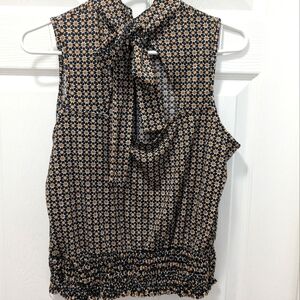 Stylish sleeveless blouse with a bow tie. Features a geometric pattern in black and tan.