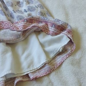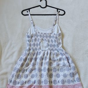 Pink/Purple pattern on white. Fit flare sundress with sweetheart neckline and spaghetti straps. There are two discreet pockets and a built in lining. Garage, size xs. Worn three times.