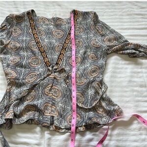 Elevate your style with this chic patterned V-neck top. Featuring a blend of gray and tan hues, it's perfect for any occasion.