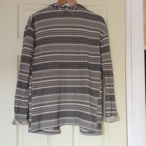 Gray and beige patterned cardigan, fold over collar and rolled sleeves
