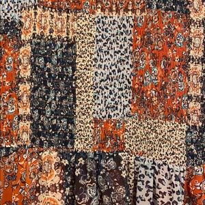 Stretchy patterned dress. Skirt is flowy. Very comfortable, great for the holidays!