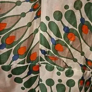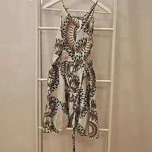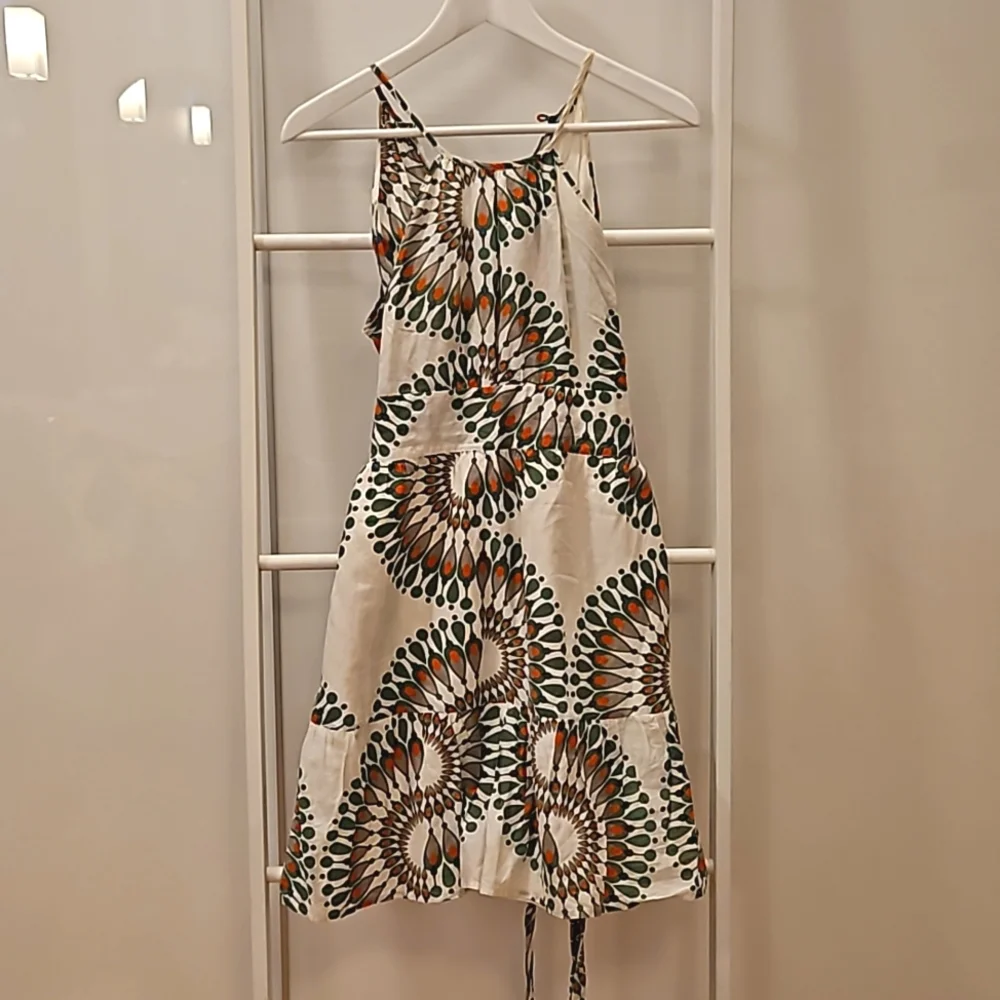 silk/cotton dress. halter neck. tie waist. green/orange pattern on white. tear at back sewn- as pictured.