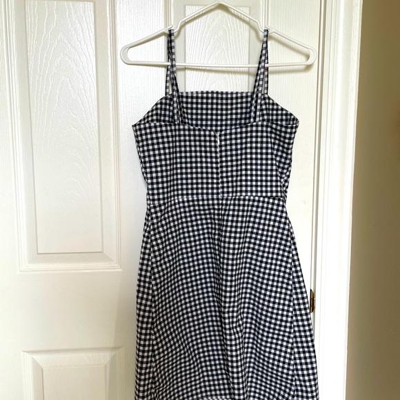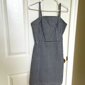 Short, sleeveless dress in patterned jersey. Straight cut at the top with narrow, shoulder straps, a seam at the waist and a flared skirt. Unlined.