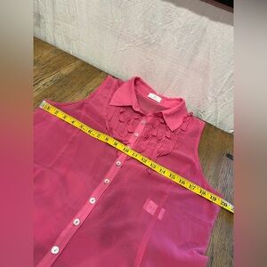 Fuchsia sleeveless blouse with button front, collar, and cascading front ruffles. Flowing and semi-sheer polyester fabric. Feminine and vibrant. Excellent condition.