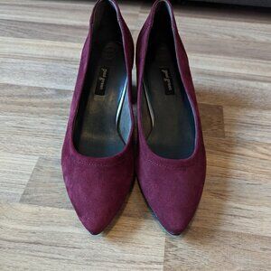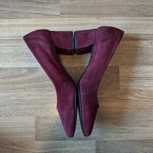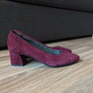 These stunning pointed toe block heeled suede shoes from Paul Green are impeccably made and in excellent used condition. In a deep wine colour, they are perfect for fall and winter. The block heel has a slight flare for more interest, but these are a classic that will never go out of style. Sensible 2 inch heels and rubber soles make these easy to walk in.