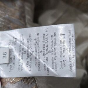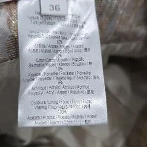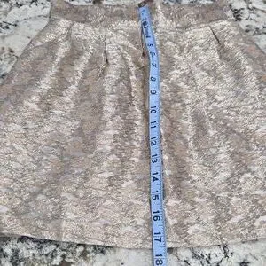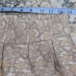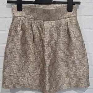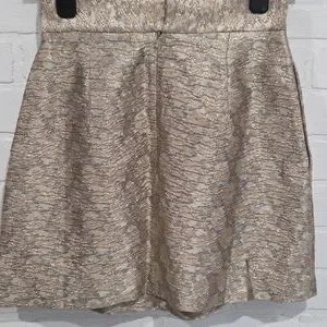 Chic metallic mini skirt with gold and silver brocade texture and slit side pockets, fully lined. Ideal for stylish outfits.
