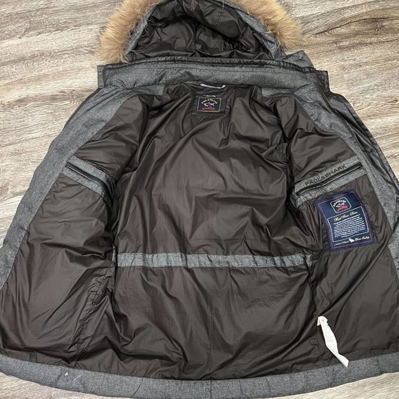 Paul & Shark winter coat, dark heather grey. Discontinued coat. Used but in very good condition. Removable hood and fur. All buttons on and original. Coat size is large, but may fit like a medium with an underlayer. Down is in great condition and has been kept dry. Recently professionally cleaned.