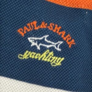 Vibrant polo with bold stripes. Features navy, orange, white, and green. Ideal for casual wear.
