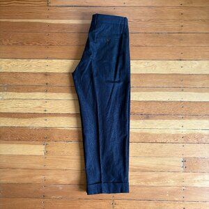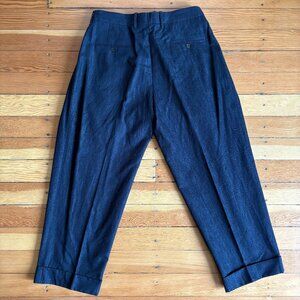 Paul Smith's wide-leg pleated trousers are a linen, cotton, and silk blend—cuffed hem with straight lie-flat pockets—deep indigo colour. Only worn a handful of times, like new.