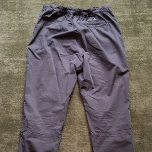 The pants are a tapered, casual trousers and made of 100% cotton. Roomy throughout the hips and thighs and tapering down toward the leg opening. They feature an elasticated waist band for extra comfort, elasticated cuffs for the jogger look, and zipped slash pockets for your valuables. The cotton is lightweight and great for warm weather.