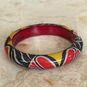 Beautiful preowned Paul Windsor designed bangle bracelet. Made of wood and featuring a colourful design entitled “Brown Bear”. In Haida culture, bears, referred to as "Elder Kinsman," are revered as noble guests and symbols of strength, courage, and leadership, with the Bear Mother story highlighting the close relationship between humans and bears.