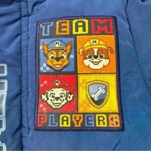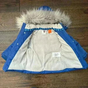 Jacket has a little wear. There is a piece of wording missing on the zipper flap. There is a snap directly beneath where the wording is missing. See photo #4.