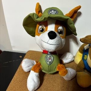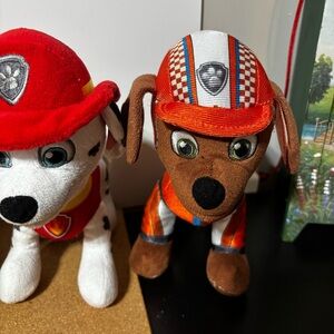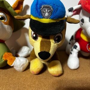Set of four Paw Patrol plush toys. Includes characters with hats and badges. Perfect for fans and collectors.