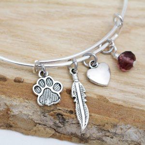 Paw Print, Feather & Heart Adjustable Charm Bangle - Handcrafted Hypoall…