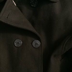 Double breasted pea coat, nautical buttons, falls below hips best for women 5’2” height or under.