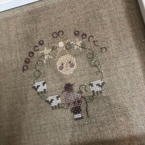 Beautiful cross stitch art in a white frame. Features intricate design with subtle colors. Saying is “peace on earth” and the design is a moon with stars and a shepherd and sheep.