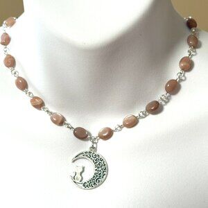 Peach Moonstone Adjustable Choker, Cat on the Moon Pendant + Genuine Gemstone