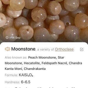 Peach Moonstone is a variety of Moonstone. It is a potassium aluminum silicate feldspar. The color is usually a tan brown to a very light peach/pink (these colors are able to be seen easier in direct sunlight). This change in color is believed to be caused from higher contents of aluminum within the feldspar’s chemical make-up. Vast quantities of Peach Moonstone have been recently coming out of Madagascar, with a majority of the material being sculpted by local artisan craftsmen and women. It is a birthstone for the month of June.