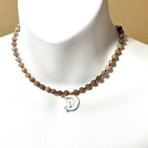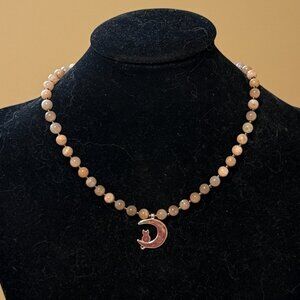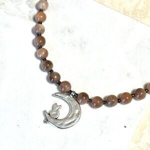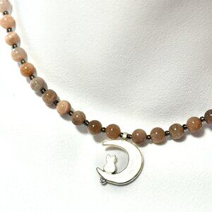Peach Moonstone Silver Cat on the Moon Necklace, Genuine Gemstone Beaded Choker