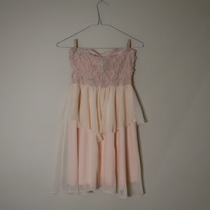 Peach textured-top, chiffon-layered strapless dress. Worn twice. Light tea-staining on outer layer, not easily visible.