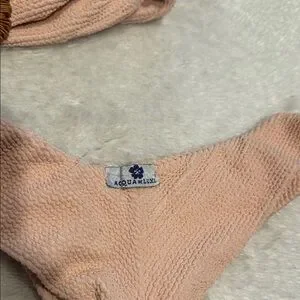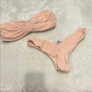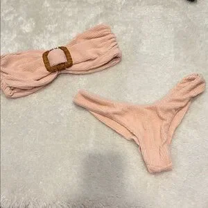 Stylish peach bikini set with a textured design. Features a bandeau top with a decorative buckle.