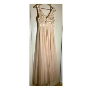 Peach Tulle net gown features Sequin and Embroidered Empire Bodice w Grosgrain Satin at waist. V zip back and deep decollete. in front. Flat pit to pit measurement at bust is 15.5”/39cm. Dry Clean only.