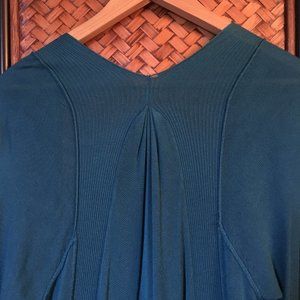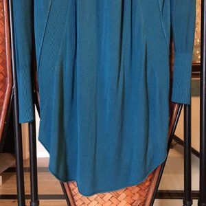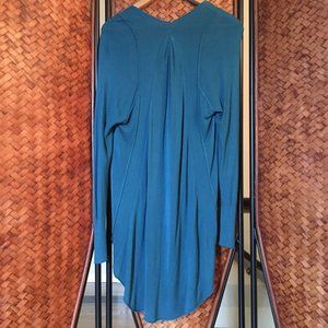 Very good preowned condition, long, peacock-blue open cardigan by Jeanne Beker. Jeanne Beker is a Canadian designer from Toronto. This gorgeous, draping, lightweight cardigan is the perfect splash of colour to any ensemble. A unique cut, that hangs beautifully.