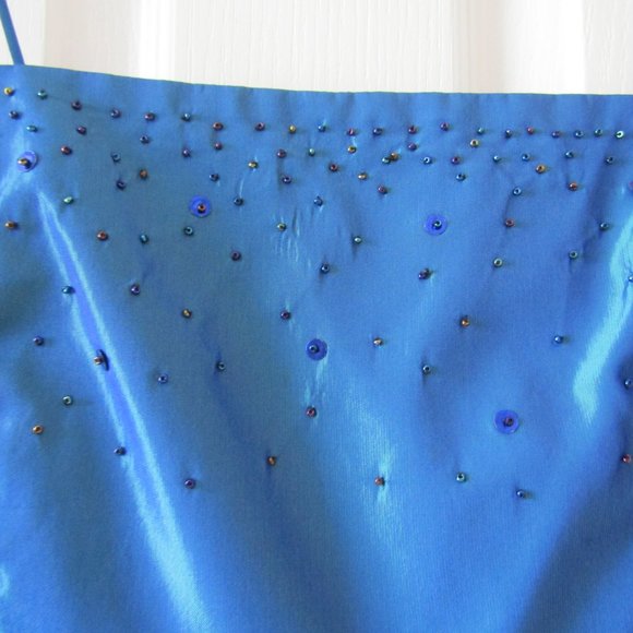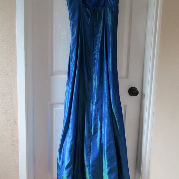Gorgeous peacock blue Prom/Bridesmaid, long dress from the year 2003. Spaghetti straps with back zip closure and lace-up ties. Front bodice is decorated with sparse beads and sequins. Size 6, Fit and Flare design flatters all body types. Excellent Condition!