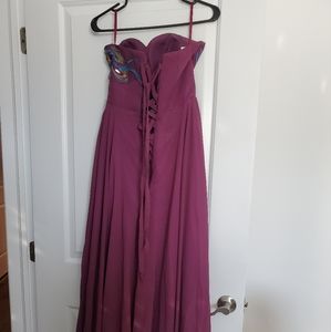 The peacock feather prom dress is a beautiful flowing purple gown. strapless with corset back.