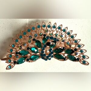 Dazzling hair clip with peacock design. Features vibrant green and clear gemstones. Adds a touch of glamour to any look.