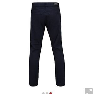 Slim fit, lower waist, water repellent, fabric, reflective racing stripes on inner cuffs, Swedish design, sold out online,