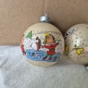 Set of Peanuts Christmas ornaments featuring Snoopy and Woodstock. Festive design with cartoon characters.