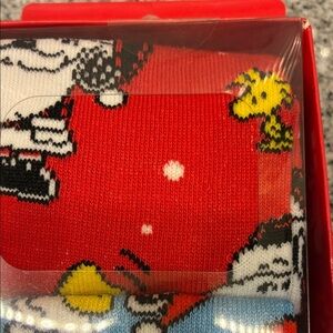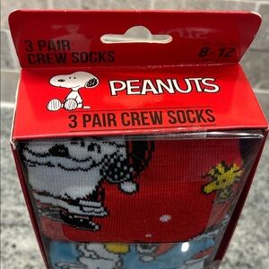 Set of three pairs Peanuts festive crew socks with Snoopy designs. Includes bold red, bright blue, and neutral gray pairs. New in box. Great gift! Fits shoe size 8-12. Unisex Bundle more than one item from my closet to save. B9