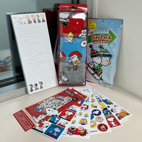 Peanuts Snoopy themed socks, activity set, fun stickers set and magnet note pad!