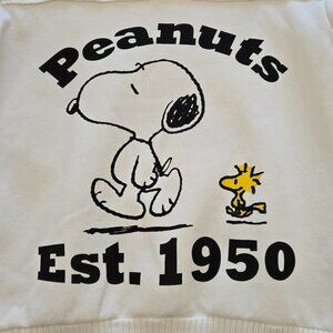 Cozy white knit sweater featuring beloved Peanuts characters Snoopy and Woodstock. Classic black and yellow graphic with “Peanuts Est. 1950” across the front. Cable knit sleeves and upper chest detail add texture and style. Perfect for fans of vintage comics or casual everyday wear.