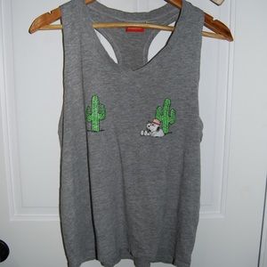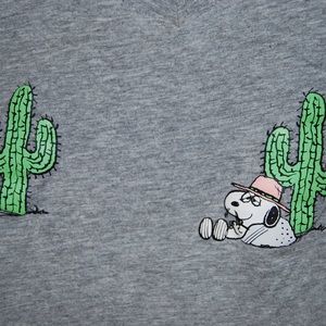 Adorable Peanuts brand tank top with Snoopy and some cacti. Size medium and in good used condition. No rips/tears. The graphics are in great condition and not worn away at all - look new. 90% cotton 10% rayon. There are quite large arm holes so would need either a sports bra, bralette, bikini top under. Measurements: