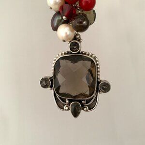 A hand-linked cluster of pearls, crystals, gemstones and red beads crowns a lovely Smokey Quartz stone, set in sterling silver, which all hangs from an open/close bail creating a lovely chain enhancer.