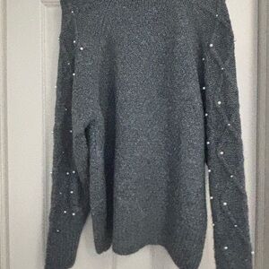 Elegant gray sweater with pearl accents. Perfect for layering.