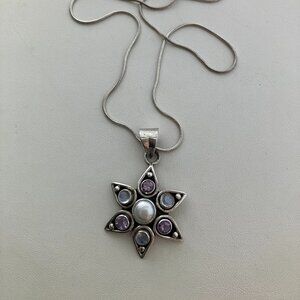 Pearl, Moon stone, Light purple gemstone, 925 Sterling Silver pendant Flower SLG & 925 Chain 18"
