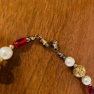 Received as a gift, In perfect condition! It is a beautiful pearl chain embedded with rubies in it.