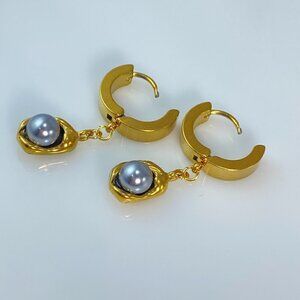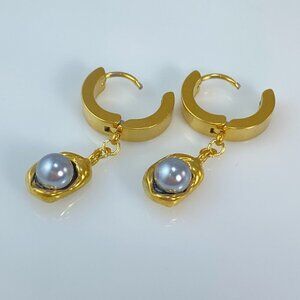 Pearl in Gold Bean Pods on Stainless Steel Huggie Hoop Earrings