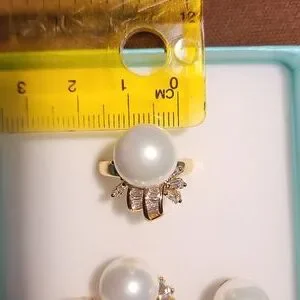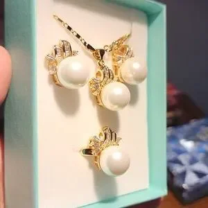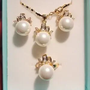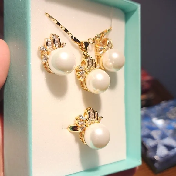 White faux pearl with zirconia stones very shiny, elegant and stunning in actual. Perfect for all occasions or everyday used. Bought them in Macau during our trip but never had the chance to wear them so I decided to sell and find a new home. Perfect condition never been used.