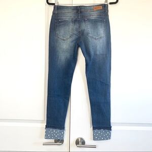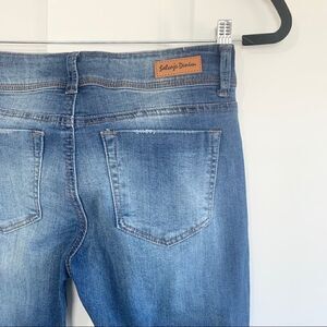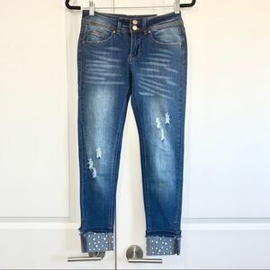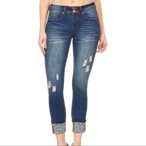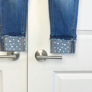 These jeans are so cute! They have pearl embellishments on the bottom cuffs and are a cropped style. There is some distressing of the thighs as well.