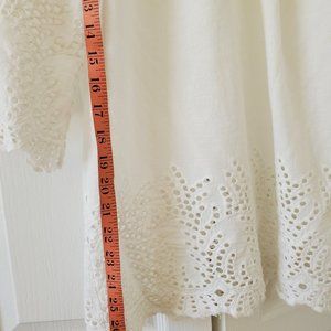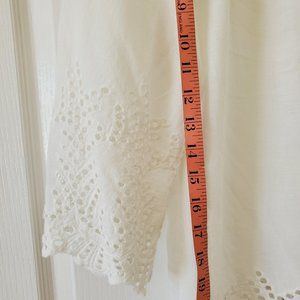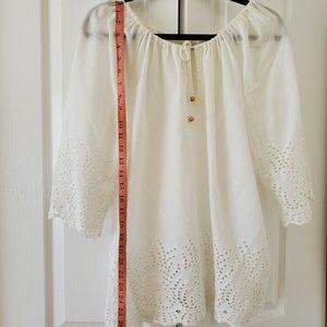 Peasant top with 3/4 flowy sleeves; scoop neck with tie (can adjust tie neckline to suit your style/size); eyelet design at lower part of flowy bodice and sleeves; a few faded marks on left sleeve; beautiful silhouette. Very feminine and pretty with jeans on a summer evening. One size.