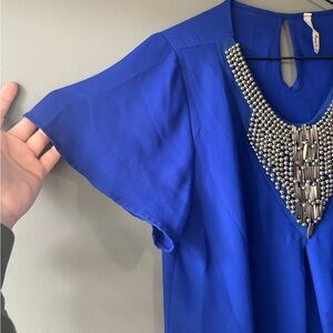 This elegant blue top features a stunning beaded neckline, perfect for adding a touch of glamour to any outfit. Ideal for both casual and formal occasions.