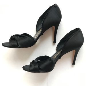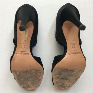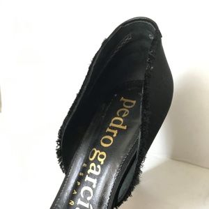 These are the Pedro Garcia Black Damaris Heels. They are worn but the only show of wear is the fraying on the edges of the shoe. It has a 3 1/2 inch heel. Comes with the box and a dust bag. Feel free to message me with any questions you have.