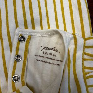 NWT 3-6 month Pehr Baby Ruffle Romper in "Stripes Away Marigold". Organic cotton & dyes from ethically sourced materials. Romper features neck and leg snaps for easy changes.